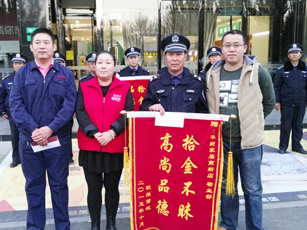 2015年10月23日18是許,保安李明寶在當(dāng)日營(yíng)業(yè)結(jié)束清場(chǎng)檢查時(shí),在張家口華耐高新店商場(chǎng)南區(qū)3層衛(wèi)生間撿到1只皮挎包,立即教到物業(yè)部值班室,經(jīng)值班人員共同檢查,內(nèi)有包括汽車鑰匙、多張信用卡、駕駛證等物品。19時(shí)30分,失主前來尋找。次日上午,為感謝李明寶,失主專程送來“拾金不昧,品德高尚”錦旗一面。